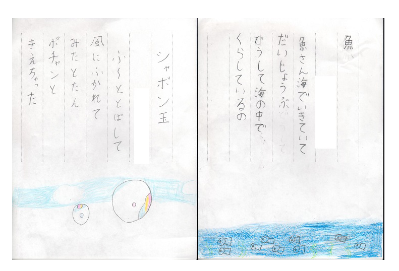 国語科「見たこと、かんじたこと」の学習で、わくわくしたり、どきどきしたり、はっと思ったことなどを『詩』に表しました。子どもたちのとっては、初めての活動だったため、なかなか書き始めることができませんでしたが、一度鉛筆が動き出すと、あっという間に作品を完成させました。中には、複数の作品を作る子も!できた作品をみんなで読み合い、大盛り上がりの学習となりました。